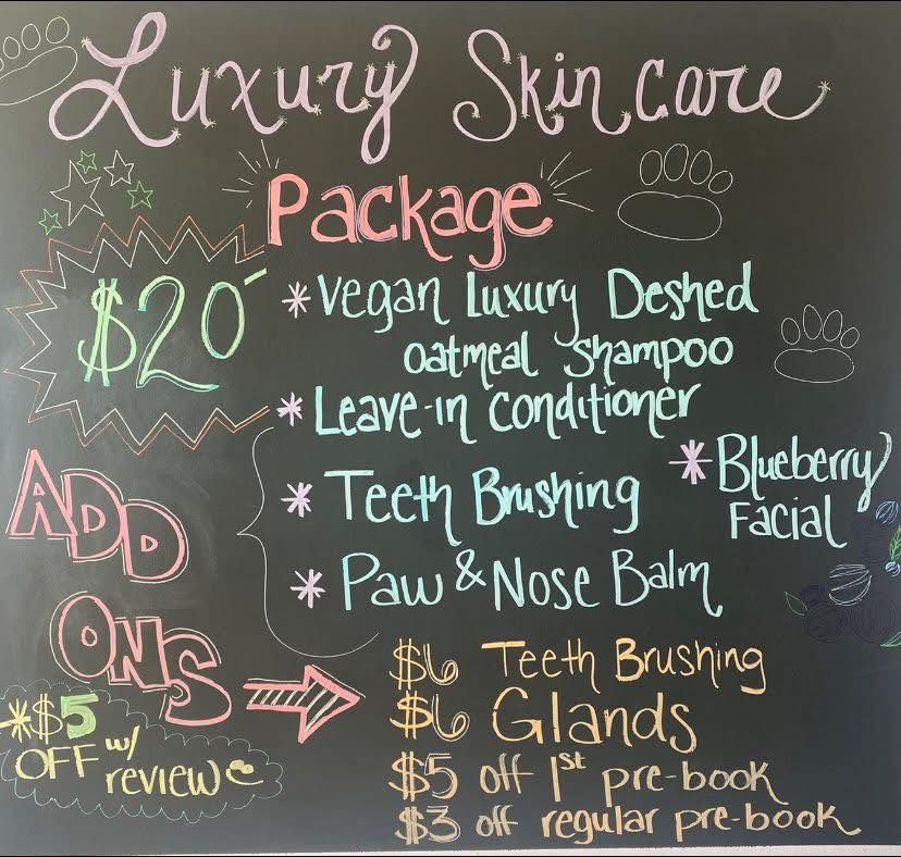 Most grooms take an avergage of 2 hours. However, time can very due to how your pet reacts to drying and if we feel we should take more time to keep your pet as stress free as possible. All Grooms include shaving of the pads, ear cleaning and nail grinding. We do offer some add ons like teeth brushing, blueberry facial and anal glands for an additional $6 or we have a $20 package that will upgrade the shampoo and conditioner listed above. We will give you a call 15 minutes prier to your pet being finished.